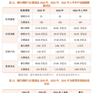 2024年上半年银行理财规模 28.52万亿元较去年底增长 6.43 %;公募基金资产净值合计31.08万亿元,较去年底增长 12.61 %。2024年上半年公募基金规模增长和增速都超过银行理财。