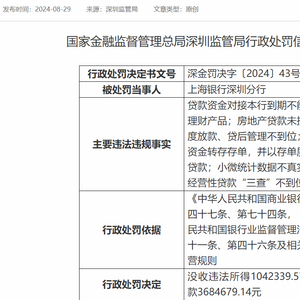 8月29日晚间,国家金融监督管理总局深圳监管局公布的行政处罚信息公开表显示,上海银行深圳分行受到“十连罚”,10张罚单总罚没金额超500万元,涉及9名相关责任人。