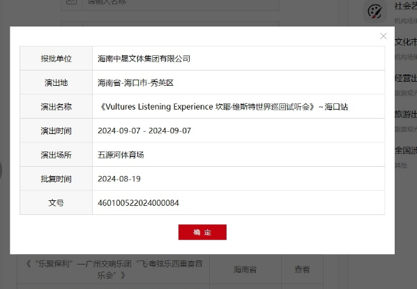 坎耶将在中国演出的消息早已在欧美乐迷圈子中引发了讨论,七月时社交平台上即有传闻称坎耶可能会在中国举行演出。日前,中华人民共和国文化和旅游部官网公布的全国涉外营业性演出活动中已出现坎耶世界巡回试听会的报备信息,报备演出时间是9月7日,地点是海口五源河体育场,由海南中昇文体集团有限公司报备,批复时间是8月19日。巡回试听会的官宣消息迅速引发了乐迷的讨论,已有不少乐迷晒出了交通购票单和酒店预定信息,表示自己已准备好中秋假期前往海口观演。