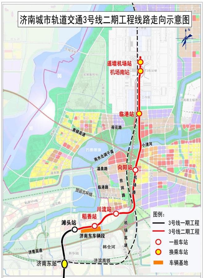 济南轨道交通3号线是一条位于城区东部贯通南北的市域快线,3号线二期工程为一期工程的北延线,南起一期终点滩头站(不含),北至遥墙机场站,线路全长约13.01km,设站6座,其中换乘站3座。