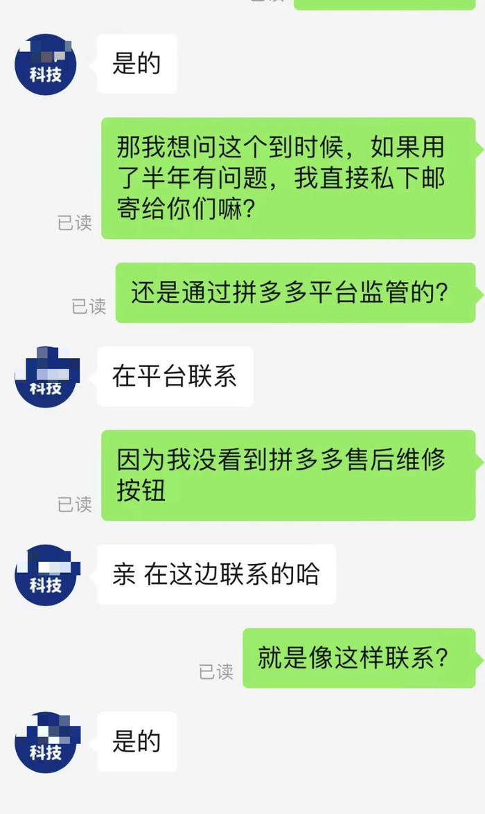 为了深入了解情况,记者在拼多多平台上随机找了非官方店铺商家进行了沟通。该商家表示,他们销售的电子产品由店铺自身提供保修服务。如果产品出现质量问题,消费者可以通过拼多多平台的在线聊天功能与商家沟通,并将聊天记录作为解决问题的证据。
