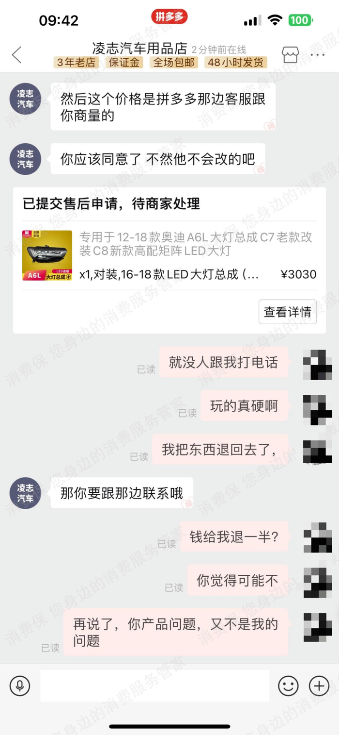 张先生日前投诉称,他于7月1号通过拼多多电商平台购买了一组汽车大灯价值3030元,然而收到货品后,张先生发现产品存在远光效果散光和近光效果铺路太窄等问题,与商家宣传相去甚远。根据与商家的售前约定,张先生在确保灯面无刮花且原包装寄回的情况下,申请了退货退款处理。