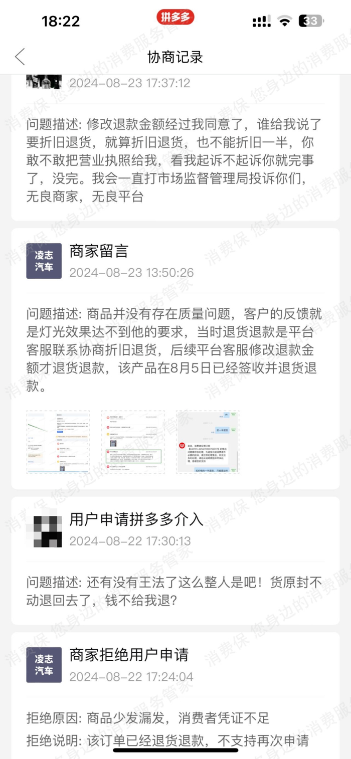 “商品质量我都不想提了,最让我生气的是拼多多工作人员直接按照折旧退款诉求把价格给改了。直到收到退款我才知道这个情况,现在商品也被商家收走了,我完全失去了主动权,拼多多必须得给我个说法,赔偿我的损失!”张先生说道。