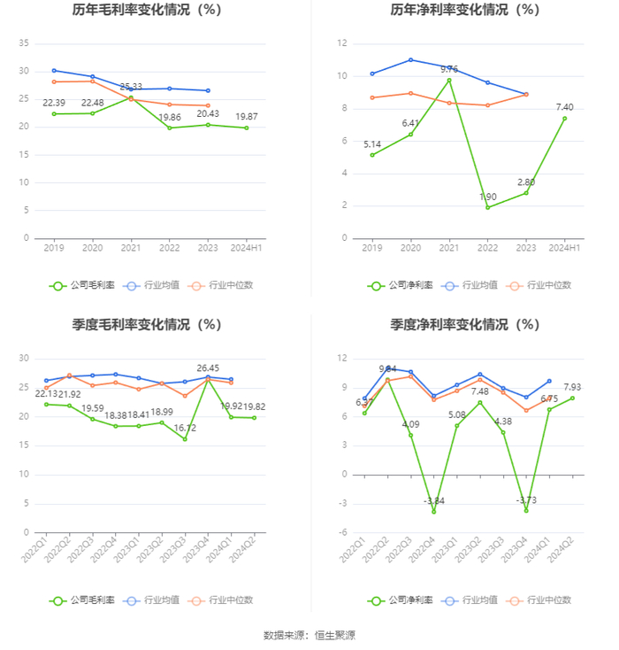 2024年上半年,公司毛利率为19.87%,同比上升1.10个百分点;净利率为7.40%,较上年同期上升0.84个百分点。从单季度指标来看,2024年第二季度公司毛利率为19.82%,同比上升0.83个百分点,环比下降0.10个百分点;净利率为7.93%,较上年同期上升0.45个百分点,较上一季度上升1.18个百分点。