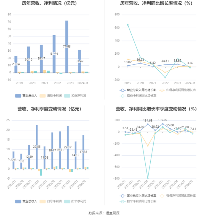 根据半年报,公司第二季度实现营业总收入17.38亿元,同比下降7.41%,环比增长23.11%;归母净利润1.11亿元,同比下降4.33%,环比增长77.84%;扣非净利润9529.89万元,同比下降28.91%,环比增长86.19%。