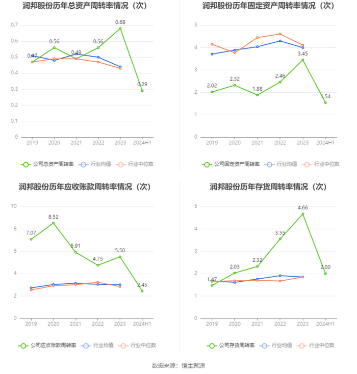 营运能力方面,2024年上半年,公司总资产周转率为0.29次,上年同期为0.27次(2023年上半年行业平均值为0.21次,公司位居同行业15/55);固定资产周转率为1.54次,上年同期为1.46次(2023年上半年行业平均值为2.17次,公司位居同行业35/55);公司应收账款周转率、存货周转率分别为2.45次、2.00次。