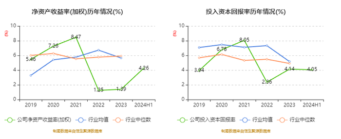 盈利能力方面, 2024年半年度公司加权平均净资产收益率为4.26%,同比上升0.36个百分点。公司2024年上半年投入资本回报率为4.05%,较上年同期上升0.01个百分点。