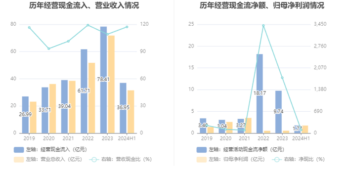 2024年上半年,公司营业收入现金比为117.32%,净现比为101.96%。