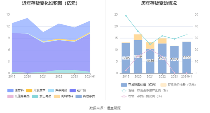 从存货变动来看,截至2024年上半年末,公司存货账面价值为13.5亿元,占净资产的33.17%,较上年末增加1.76亿元。其中,存货跌价准备为406.84万元,计提比例为0.3%。