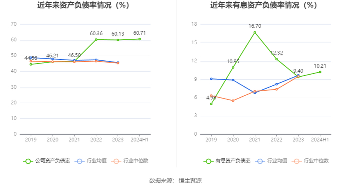 在偿债能力方面,公司2024年上半年末资产负债率为60.71%,相比上年末上升0.58个百分点;有息资产负债率为10.21%,相比上年末上升0.81个百分点。