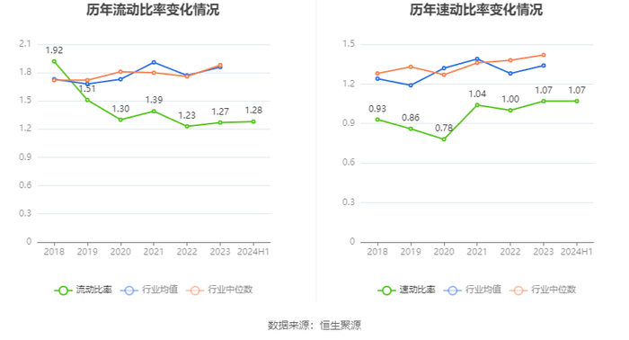 2024年上半年,公司流动比率为1.28,速动比率为1.07。