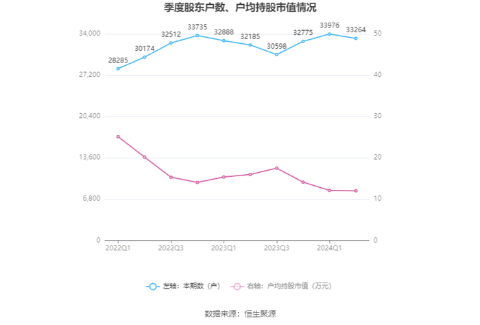 筹码集中度方面,截至2024年上半年末,公司股东总户数为3.33万户,较一季度末下降了712户,降幅2.10%;户均持股市值由一季度末的12.11万元下降至12.02万元,降幅为0.74%。