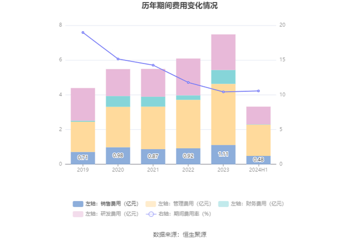2024年上半年,公司期间费用为3.33亿元,较上年同期增加3262.11万元;期间费用率为10.56%,较上年同期上升0.67个百分点。其中,销售费用同比增长25.7%,管理费用同比增长32.79%,研发费用同比增长1.25%,财务费用同比下降90.35%。