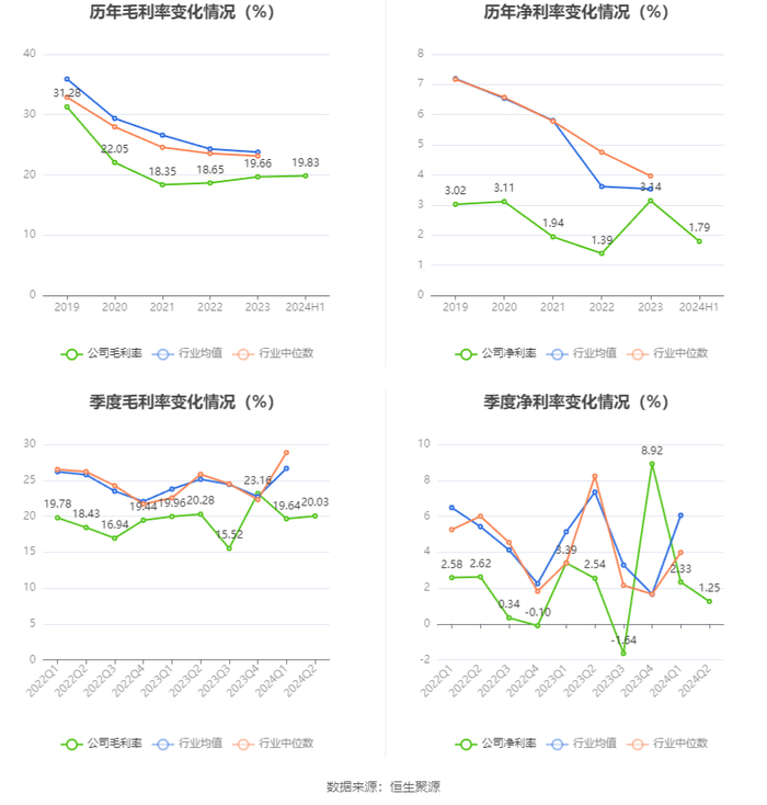 2024年上半年,公司毛利率为19.83%,同比下降0.29个百分点;净利率为1.79%,较上年同期下降1.17个百分点。从单季度指标来看,2024年第二季度公司毛利率为20.03%,同比下降0.25个百分点,环比上升0.39个百分点;净利率为1.25%,较上年同期下降1.29个百分点,较上一季度下降1.08个百分点。