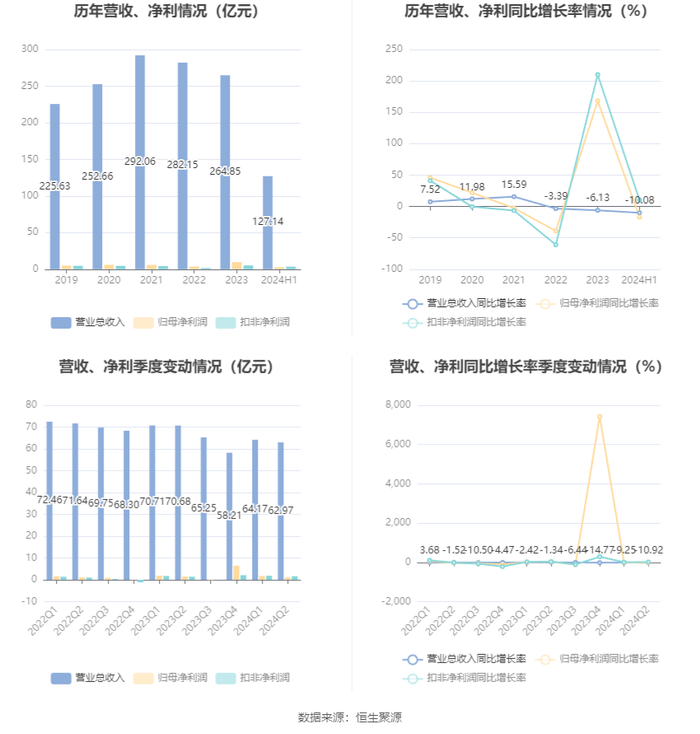 根据半年报,公司第二季度实现营业总收入62.97亿元,同比下降10.92%,环比下降1.88%;归母净利润1.08亿元,同比下降28.19%,环比下降37.29%;扣非净利润1.63亿元,同比增长14.78%,环比下降12.25%。