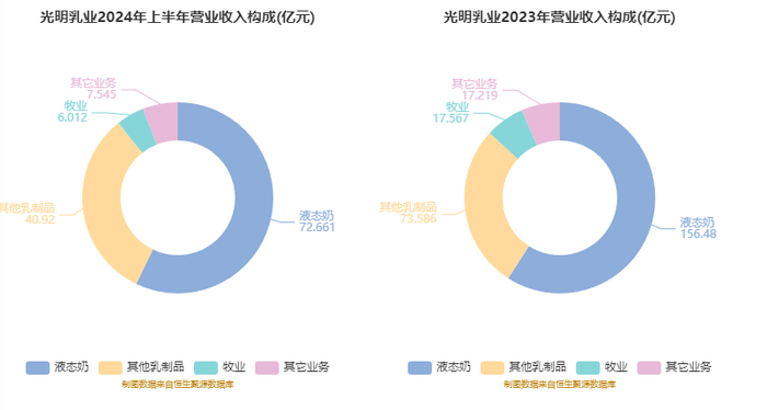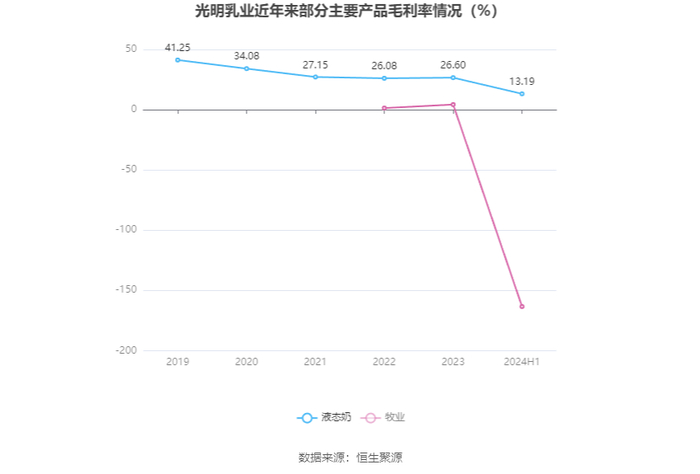 分产品来看,液态奶、其他乳制品、牧业2024年上半年毛利率分别为13.19%、1.49%、-163.37%。