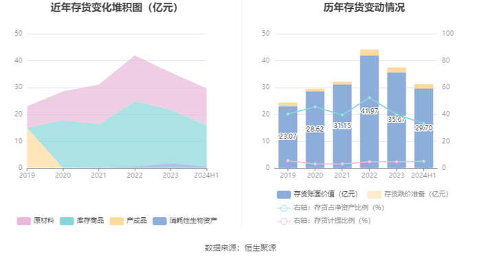 从存货变动来看,截至2024年上半年末,公司存货账面价值为29.7亿元,占净资产的33.46%,较上年末减少5.97亿元。其中,存货跌价准备为1.62亿元,计提比例为5.16%。