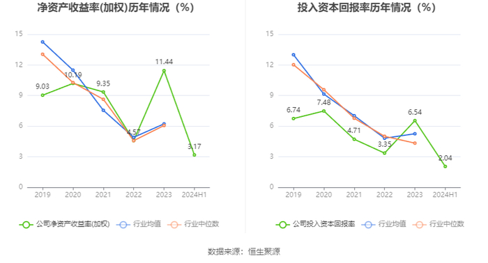 盈利能力方面, 2024年半年度公司加权平均净资产收益率为3.17%,同比下降1.02个百分点。公司2024年上半年投入资本回报率为2.04%,较上年同期下降1.27个百分点。