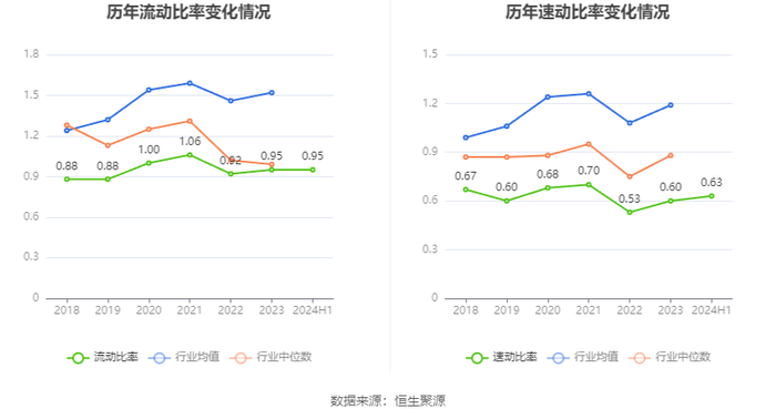 2024年上半年,公司流动比率为0.95,速动比率为0.63。