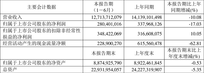 2024年上半年,公司经营活动现金流净额为2.29亿元,同比下降62.81%;筹资活动现金流净额-5.25亿元,同比增加778.05万元;投资活动现金流净额-1.86亿元,上年同期为-3.09亿元。