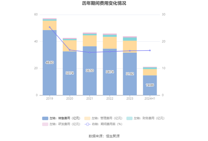 2024年上半年,公司期间费用为21.24亿元,较上年同期减少2.21亿元;但期间费用率为16.70%,较上年同期上升0.12个百分点。其中,销售费用同比下降13.59%,管理费用同比下降2.07%,研发费用同比增长12.0%,财务费用同比增长16.8%。
