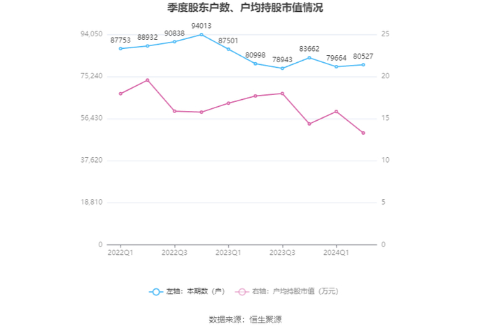 筹码集中度方面,截至2024年上半年末,公司股东总户数为8.05万户,较一季度末增长了863户,增幅1.08%;户均持股市值由一季度末的15.85万元下降至13.30万元,降幅为16.09%。