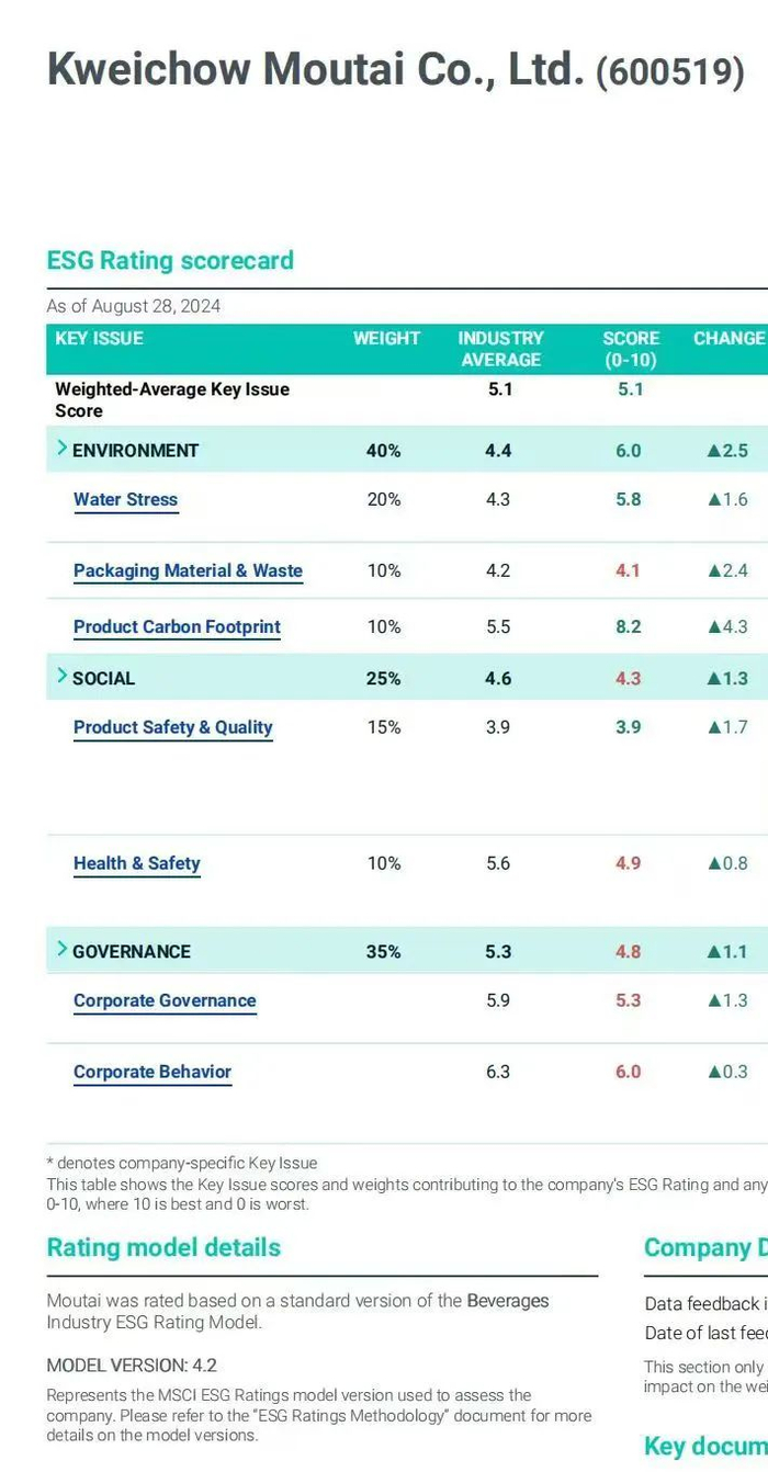 5.7分,评级BBB!这是贵州茅台在MSCI ESG的最新评级,也是自纳入MSCI ESG评级以来的最高表现,同时凭借BBB评级,贵州茅台也拿下了国内蒸馏酒与葡萄酒行业的最高得分,并跻身中国内地饮料行业第三名,仅次于重庆啤酒农夫山泉