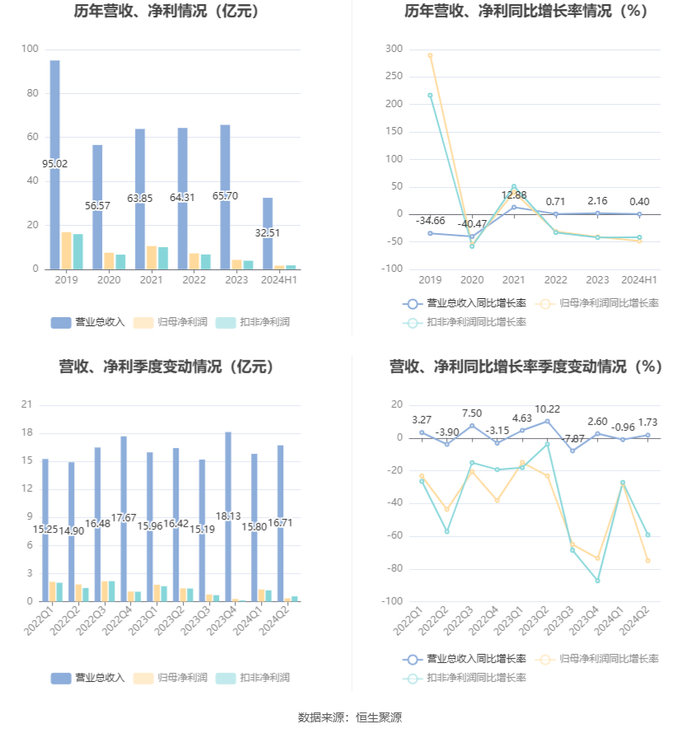 根据半年报,公司第二季度实现营业总收入16.71亿元,同比增长1.73%,环比增长5.73%;归母净利润3543.38万元,同比下降74.97%,环比下降72.70%;扣非净利润5715.89万元,同比下降59.25%,环比下降52.59%。