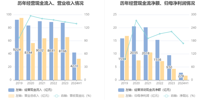 2024年上半年,公司营业收入现金比为129.49%,净现比为168.15%。