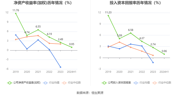 数据显示,2024年上半年公司加权平均净资产收益率为0.95%,较上年同期下降0.91个百分点;公司2024年上半年投入资本回报率为0.96%,较上年同期下降0.86个百分点。