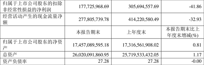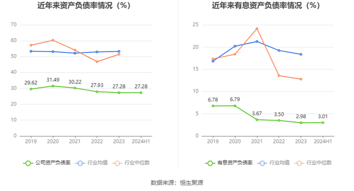 在偿债能力方面,公司2024年上半年末资产负债率为27.28%,相比上年末基本持平;有息资产负债率为3.01%,相比上年末上升0.03个百分点。