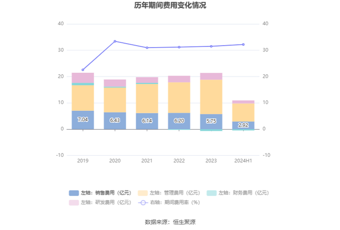 2024年上半年,公司期间费用为10.47亿元,较上年同期增加1.02亿元;期间费用率为32.20%,较上年同期上升3.02个百分点。其中,销售费用同比增长2.35%,管理费用同比增长20.01%,研发费用同比下降2.98%,财务费用由去年同期的-3221.67万元变为-4763.98万元。