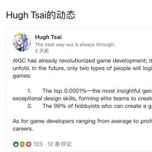 8月28日,蔡浩宇在个人领英主页上发文表示,AIGC(生成式人工智能)将彻底改变游戏开发行业。他认为,未来游戏创造将只属于两类人,顶尖的天才团队和业余爱好者。其中0.0001%的顶尖人才将组成精英团队,创造出前所未有的游戏作品;而99%的业余爱好者则可以根据自己的兴趣随意创造游戏。