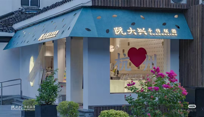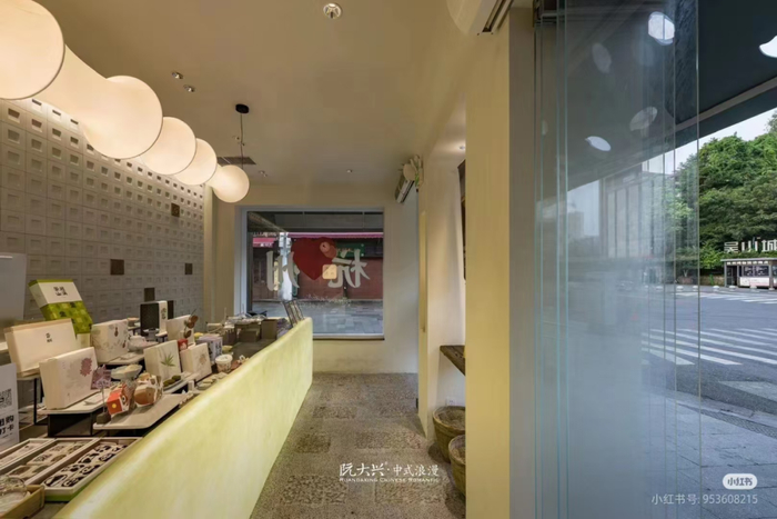 此外,每家门店突出明档手作,消费者可看到筛粉、雕空、加印、切糕、脱框、上蒸、出笼等多达数十道的糕点制作工序;同时,门面营造中式意境,杭州河坊街店色彩灵感来自《千里江山图》。