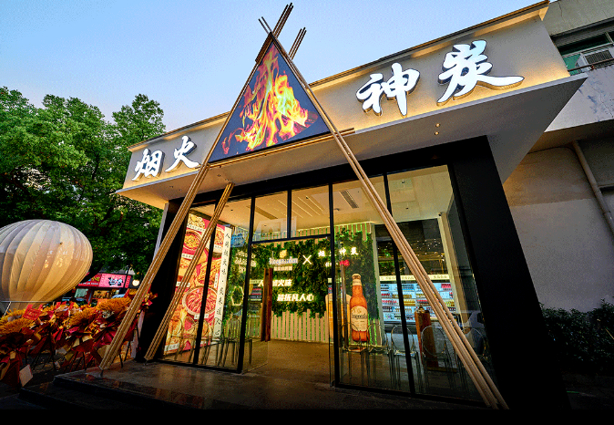 值得注意都是,去年赠李白还开辟了一个新品牌2000平仓储式自助烧烤——烟火神炭,正宗重庆风味,川渝烟火气息,露营风+仓储式。