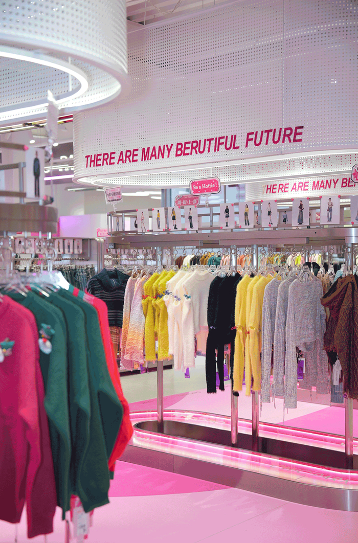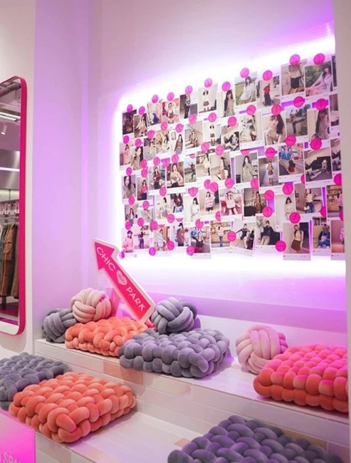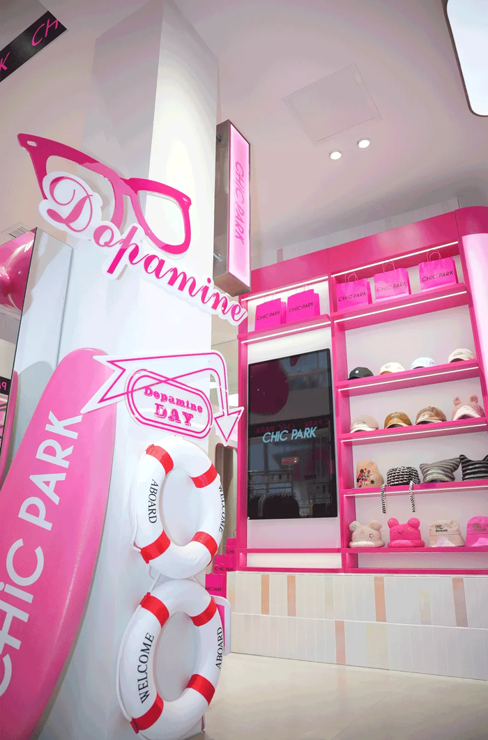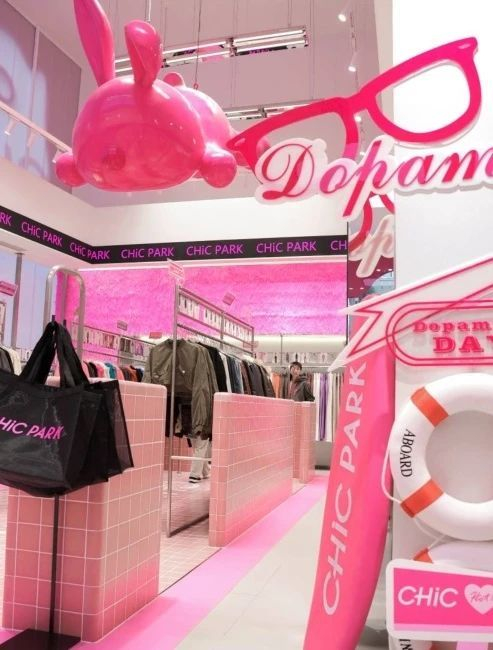 品牌致力于打造快节奏与潮流时尚完美契合的专属空间,粉色兔子门头为品牌标志性元素,店内设有多处潮流打卡装置,如粉红游泳池、滑板装置、照片墙、ins风网红镜等,拍照打卡非常出片。