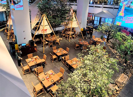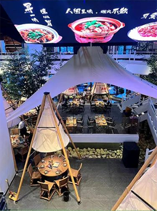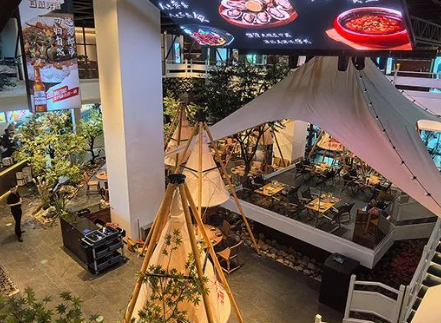 2000多平、两层的建筑,中庭两层挑高通过天然树木、溪流、民宿、天幕相结合的元素进行空间改造,将整个适合露营的湿地大自然景观搬进室内,营造出轻松的就餐环境。