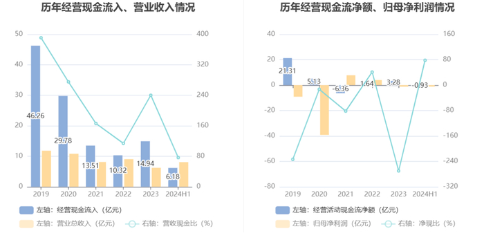 进一步统计发现,2024年上半年公司自由现金流为-4.10亿元,上年同期为1.51亿元。