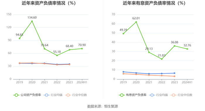 在偿债能力方面,公司2024年上半年末资产负债率为70.90%,相比上年末上升2.50个百分点;有息资产负债率为32.76%,相比上年末下降3.32个百分点。