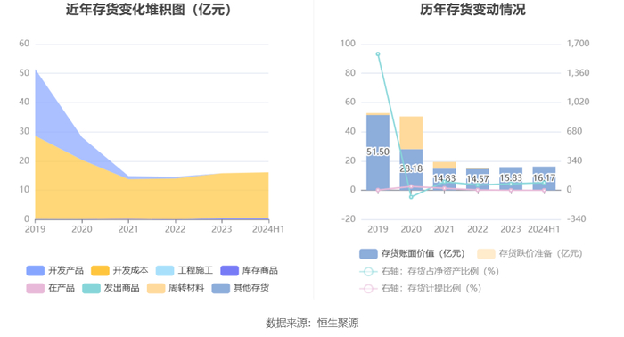 从存货变动来看,截至2024年上半年末,公司存货账面价值为16.17亿元,占净资产的88.1%,较上年末增加3367.36万元。其中,存货跌价准备为10.87万元,计提比例为0.01%。