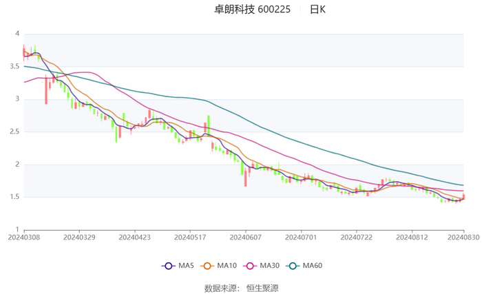 以8月30日收盘价计算,卓朗科技目前市盈率(TTM)约为-19.85倍,市净率(LF)约为2.86倍,市销率(TTM)约为4.46倍。