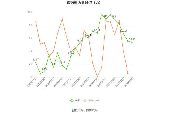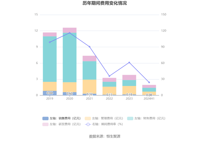2024年上半年,公司期间费用为1.96亿元,较上年同期增加3277.37万元;但期间费用率为24.21%,较上年同期下降40.17个百分点。其中,销售费用同比增长24.49%,管理费用同比增长18.36%,研发费用同比增长3.76%,财务费用同比增长37.21%。