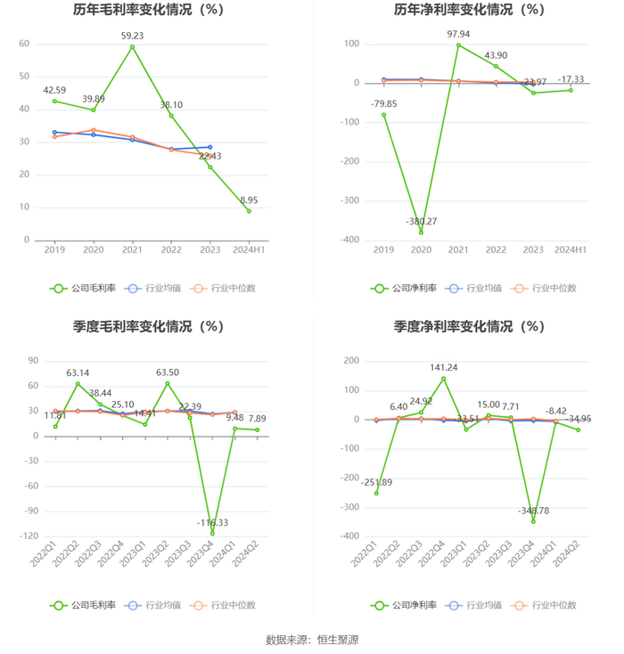 2024年上半年,公司毛利率为8.95%,同比下降41.81个百分点;净利率为-17.33%,较上年同期下降19.75个百分点。从单季度指标来看,2024年第二季度公司毛利率为7.89%,同比下降55.61个百分点,环比下降1.59个百分点;净利率为-34.95%,较上年同期下降49.95个百分点,较上一季度下降26.53个百分点。