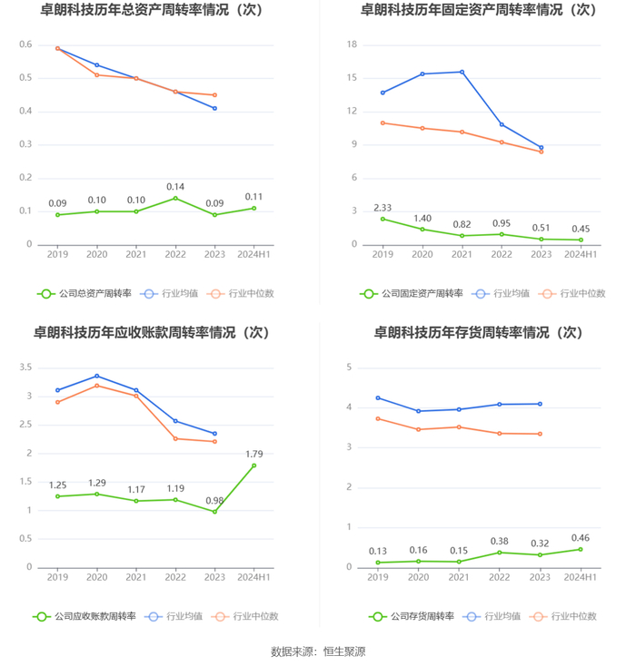 营运能力方面,2024年上半年,公司总资产周转率为0.11次,上年同期为0.04次(2023年上半年行业平均值为0.19次,公司位居同行业129/131);固定资产周转率为0.45次,上年同期为0.29次(2023年上半年行业平均值为4.24次,公司位居同行业130/131);公司应收账款周转率、存货周转率分别为1.79次、0.46次。
