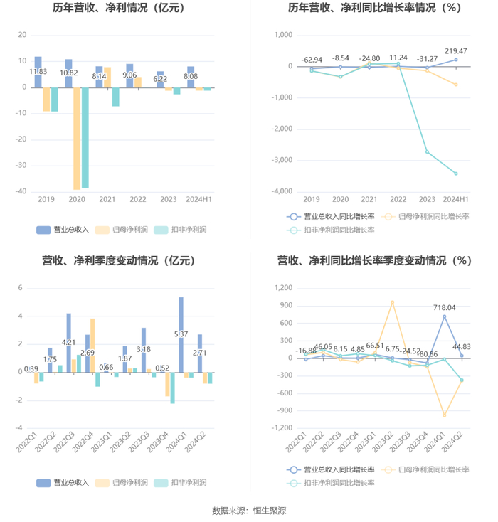 数据显示,2024年上半年公司加权平均净资产收益率为-5.99%,较上年同期下降6.96个百分点;公司2024年上半年投入资本回报率为-1.50%,较上年同期下降2.56个百分点。