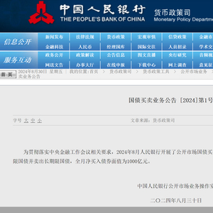 北京商报讯(记者 岳品瑜 董晗萱)8月30日,人民银行重磅发布国债买卖业务公告 [2024]第1号,为贯彻落实中央金融工作会议相关要求,2024年8月人民银行开展了公开市场国债买卖操作,向部分公开市场业务一级交易商买入短期限国债并卖出长期限国债,全月净买入债券面值为1000亿元。