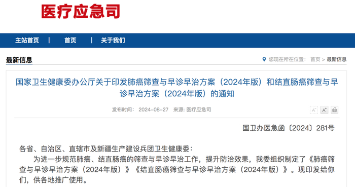 8月27日,国家卫生健康委发布《肺癌筛查与早诊早治方案(2024年版)》和《结直肠癌筛查与早诊早治方案(2024年版)》。