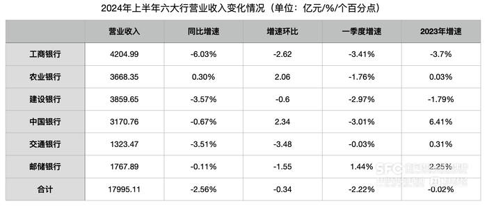 8月30日晚间,六大行2024年上半年财报披露完毕。据21世纪经济报道记者测算,上半年六大行共计实现营业收入、归属于上市公司净利润分别为17995.11亿元、6833.88亿元,同比增速为-2.56%、-0.96%,与一季度的-2.22%、-2.02%相比“一降一升”。