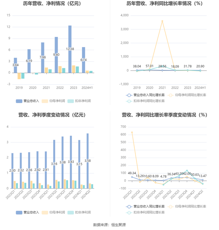 根据半年报,公司第二季度实现营业总收入3.58亿元,同比增长13.47%,环比增长13.65%;归母净利润3334.84万元,同比下降40.17%,环比增长26.67%;扣非净利润2831.14万元,同比下降38.31%,环比增长26.91%。