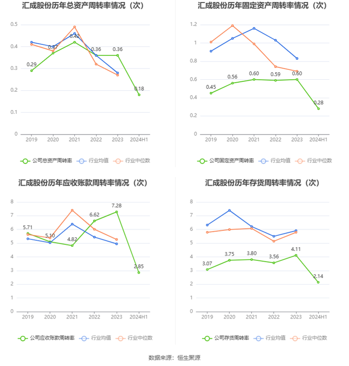 营运能力方面,2024年上半年,公司总资产周转率为0.18次,上年同期为0.17次(2023年上半年行业平均值为0.14次,公司位居同行业4/13);固定资产周转率为0.28次,上年同期为0.30次(2023年上半年行业平均值为0.40次,公司位居同行业10/13);公司应收账款周转率、存货周转率分别为2.85次、2.14次。